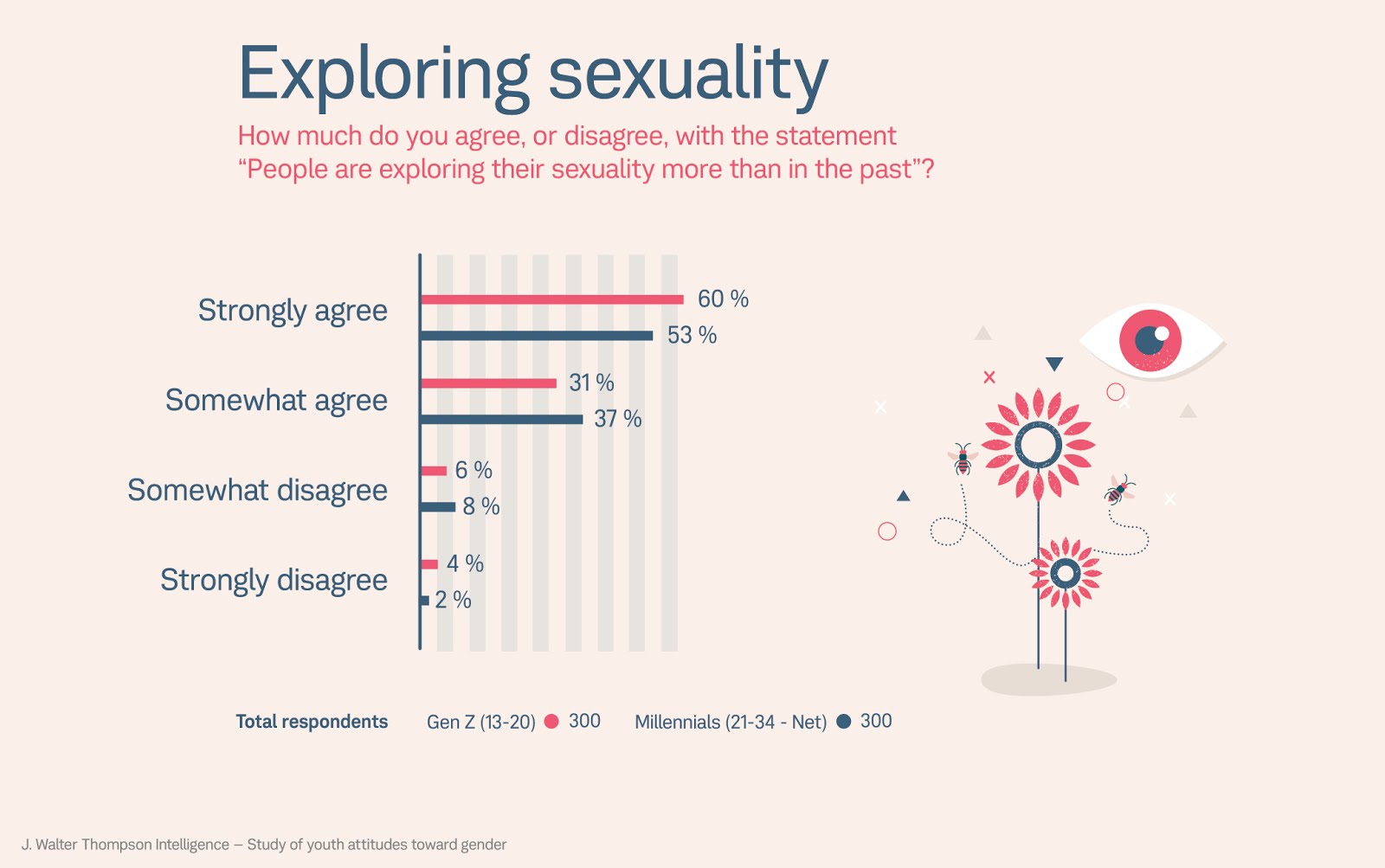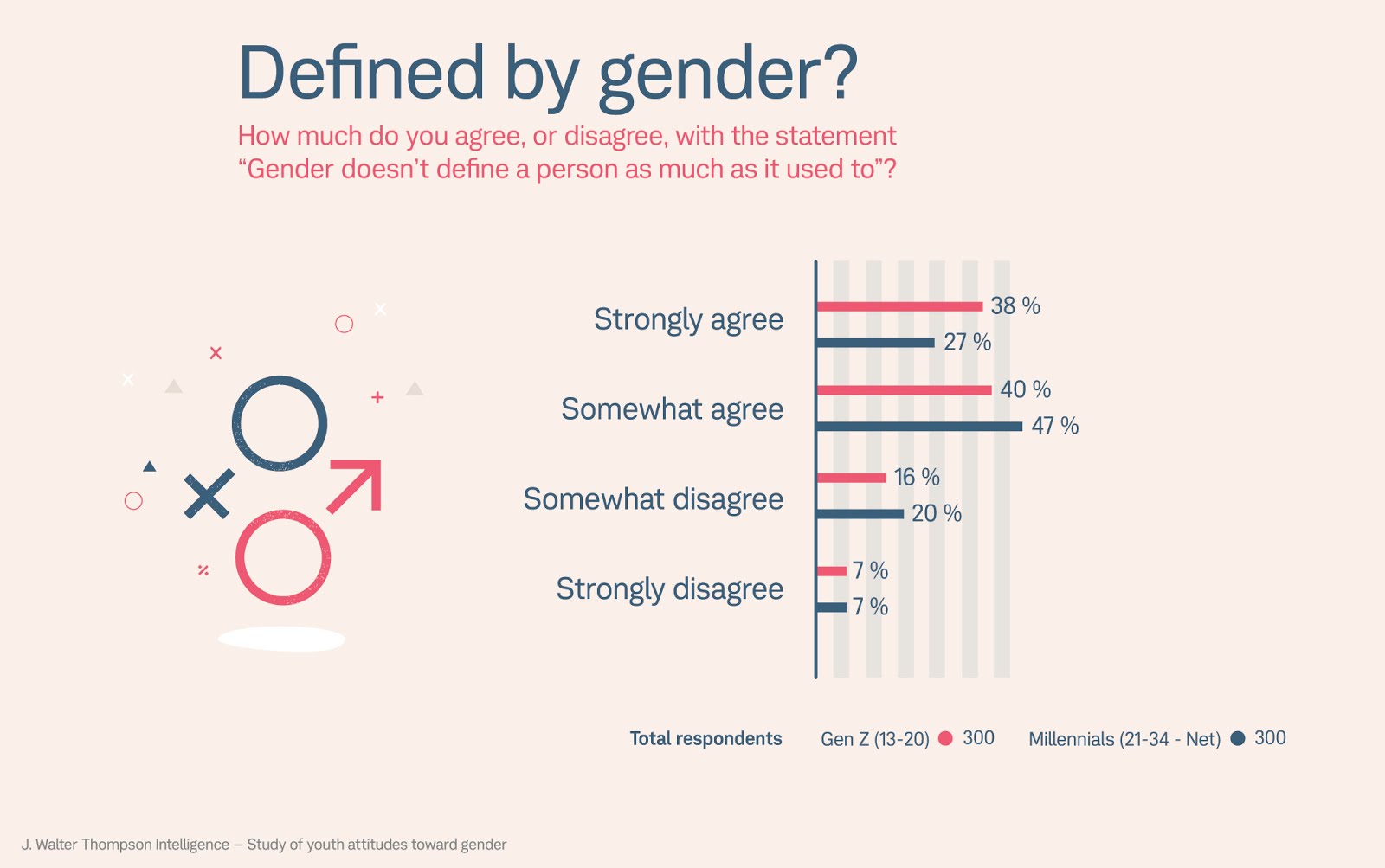 More than 1/3 of Gen Z studied “strongly agreed that gender did not define a person as much as it used to” as opposed to those 28 yr. Old and up for whom this figure dropped by 23%.