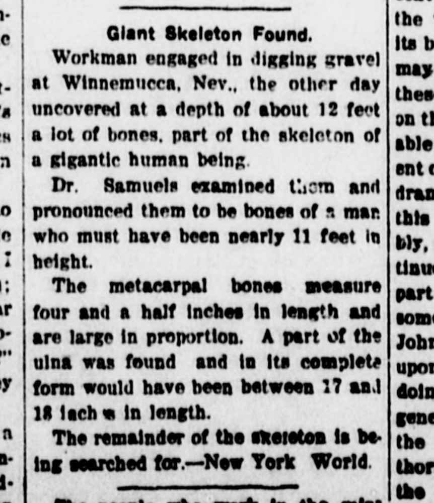 Giant Skeleton Found. Workman engaged in digging gravel at Winnemucca, Nev., the other day uncovered at a depth of about 12 feet a lot of bones, part of the skeleton of a gigantic human being. Dr. Samuels examined them and pronounced them to be bones of a man who must have been neatly 11 feet in height. The metacarpal bones measure four and a half inches in length and are large in proportion. A part of the ulna was found and in its complete form would have been between 17 and 18 inch ± in length.