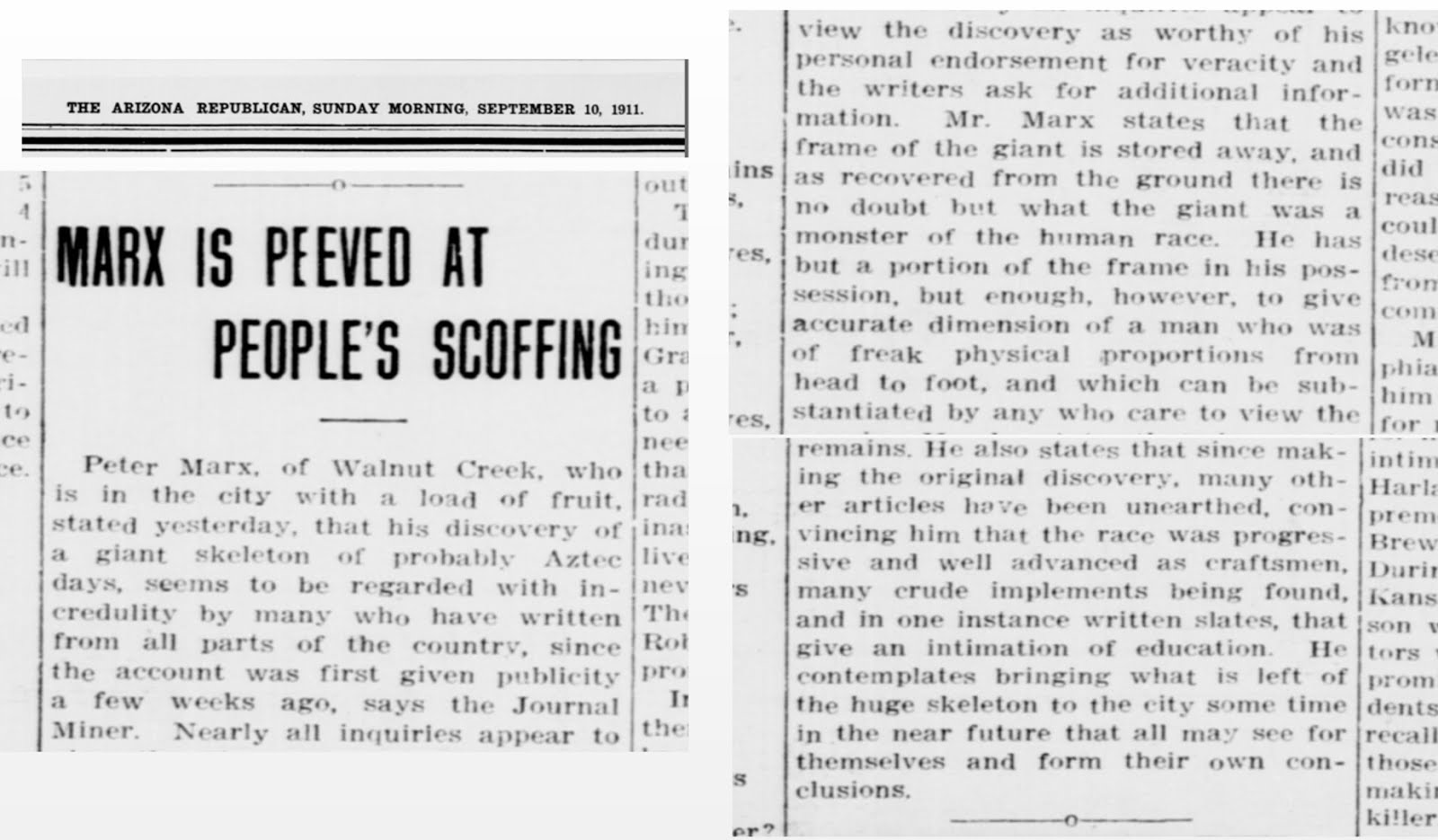 MARX IS PEEVED AT PEOPLE’S SCOFFING Peter Marx, of Walnut Creek, who is in the city with a loud of fruit, stated yesterday, that his discovery of a giant skeleton of probably Aztec days, seems to be regarded with in credulity by many who have written from all parts of the country, since the account was first given publicity a few weeks ago, says the Journal Miner. Nearly all inquiries appear to view the discovery as worthy of his personal endorsement for veracity and the writers ask for additional information. Mr. Marx states that the frame of the giant is stored away, and as recovered from the ground there is no doubt but what the giant was a monster of the human race. He has but a portion of the frame in his possession, but enough, however, to give accurate dimension of a man who was of freak physical proportions from head to foot, and which can be substantiated by any who care to view the remains. He also states that since making the original discovery, many other articles have been unearthed, convincing him that the race was progressive and well advanced as craftsmen, many crude implements being found and in one instance written slates, that give an intimation of education.
