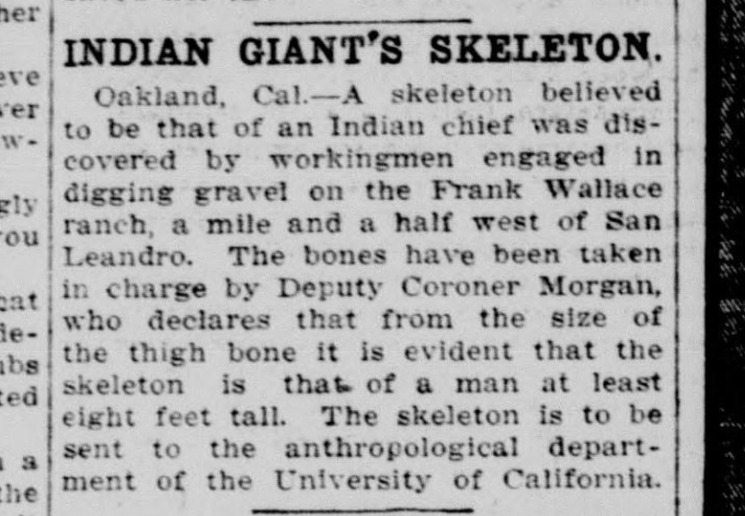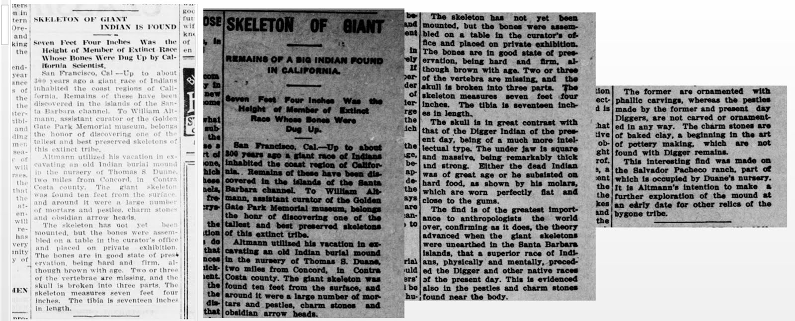 The San Juan Islander, 23 Aug. 1912, “REMAINS OF A BIG INDIAN FOUND IN CALIFORNIA – Seven Feet Four Inches Was the Height of Member of Extinct Race Whose Bones Were Dug Up” also East Oregonian, 10 Aug. 1912:
