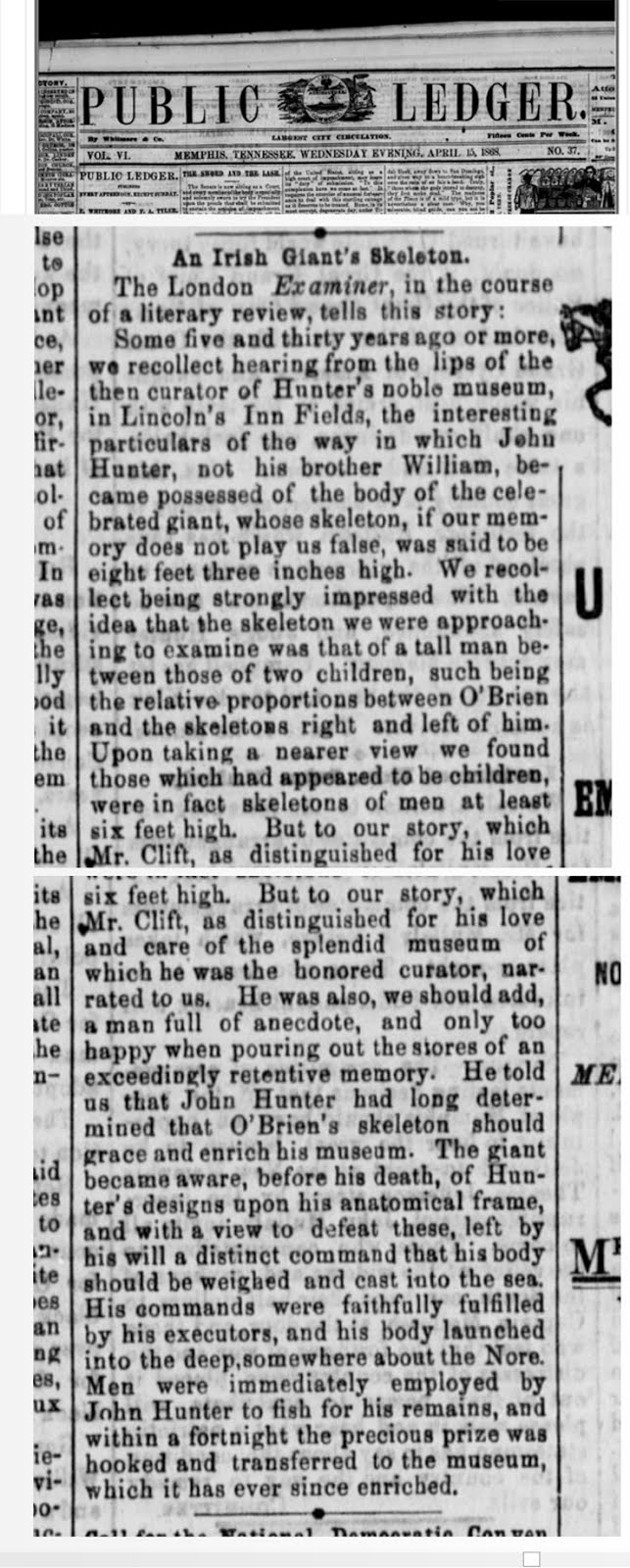An Irish Giant’s Skeleton. The London Examiner, in the course of a literary review, tells this story: Some five and thirty years ago or more, we recollect hearing from the lips of the then curator of Hunter’s noble museum, in Lincoln’s Inn Fields, the interesting particular of the war in which Jehu Hunter, not his brother William, became possessed of the body of the celebrated giant, whose skeleton, if our memory does not play us false, was said to be eight feet three inches high. We recollect being strongly impressed with the idea that the skeleton we were approaching to examine was that of a tall man between those of two children, such being the relative proportion between O’Brien and the skeletons right and left of him. Upon taking a nearer view we found those which had appeared to be children, were in fact skeleton of men at least six feet high. But to our story, which Mr. Clift, as distinguished for his love and care of the splendid museum of which he was the honored curator, narrated to us. He was also, we should add, a man full of anecdote, and only too happy when pouring out the stores of an exceedingly retentive memory. He told us that John Hunter had long determined that O’Brien’s skeleton should grace and enrich his museum. The giant became aware, before his death, of Hunter’s design upon his anatomical frame, and with a view to defeat these, left by his will a distinct command that his body should be weighed and cast into the sea. His commands were faithfully fulfilled by his executors, and his body launched into the deep, somewhere about the Nore.