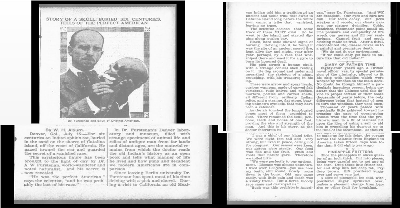 STORY OF A SKULL, BURIED SIX CENTURIES, TELLS OF THE PERFECT AMERICAN By W. H. Alburn. Denver, Col., July 19.—For six centuries an Indian sphinx sat, buried in the sand on the shores of Catalina island, off the coast of California. He gazed toward the sea and guarded the secret of a vanished race. This mysterious figure has been brought to the light of day by Dr. A. W. Furstenan, world-wanderer and noted naturalist, and his secret is now revealed. “He was the perfect American,” says the scientist, “and he was probably the last of his race.” In Dr. Furstenan’s Denver laboratory and museum, filled with strange specimens of animal life and relics of antique man from far lands and distant ages, are the material remains from which the doctor reads the old Indian’s history as an open book and tells what manner of life he lived and how puny and decadent we modern Americans are in comparison. Since leaving Berlin university Dr. Furstenan has spent most of his time delving with a pick and shovel. During a visit to California an old Mexican Indian told him a tradition of an ancient and noble tribe that dwelt in Catalina island long before the white men came, a tribe that vanished, leaving no trace. The scientist, decided that some trace of them MUST exist. So he went to the island and started digging along Avalon bay. Black, hard sand showed signs of burning. Delving into it, he found it was the site of an ancient sacred fire, kept alive day and night, year after year, perhaps, by a race that worshiped there and used it for a pyre to burn its honored dead. His pick struck a human skull, with a strange conical shell, resting on it. He dug around and under and unearthed the skeleton of a giant, crouching, with his treasures in his lap. These were arrow and spear heads, curious wampum made of carved fish vertebrae, rude knives and needles, mortars, pestles and carved shells, all different from ordinary Indian relics, and a strange, fiat stone, bearing unknown symbols, that may have been a calendar. As the air touched the long-buried bones most of them crumbled to dust. There remained the skull, jaw bone, teeth and bones of one foot, proving the size and strength of the man. And this is his story, as the doctor interprets it: “I was a chief of our island tribe. We were eight feet tall and very strong, but lived in peace, caring not for conquest. Our senses were keen, our nerves were steady. Our food was fish and the fruit, grain and roots that nature gave. Therefore we toiled little. “We were perfectly to our environment. Disease was almost unknown. I lived over 100 years you see how my teeth, still sound, slowly wore down to the bone. Old age came easily, with little pain and death was a kindly friend. But a fierce, bloody race came and destroyed us.” “Such was this prehistoric American,” says Dr. Furstenan. “And WE are decadent. Our eyes and ears are dull.” Our teeth decay, our jaws weak and recede, our chests narrow, our stature dwindles. Colds, headches, rheumatic pains assail us. The pressure and complexity of life wreck our nerves and fill our sanitariums. Canned fruit and much, clothing make us frail. After a fitful, discontented life, disease drives us to a painful and premature death. “We do not fit our environment.