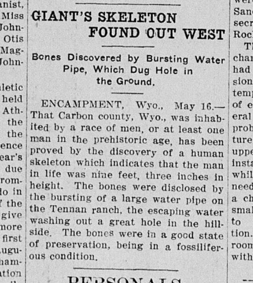 GIANT’S SKELETON POUND OUT WEST Bones Discovered by Bursting Water Pipe, Which Dug Hole in the Ground.