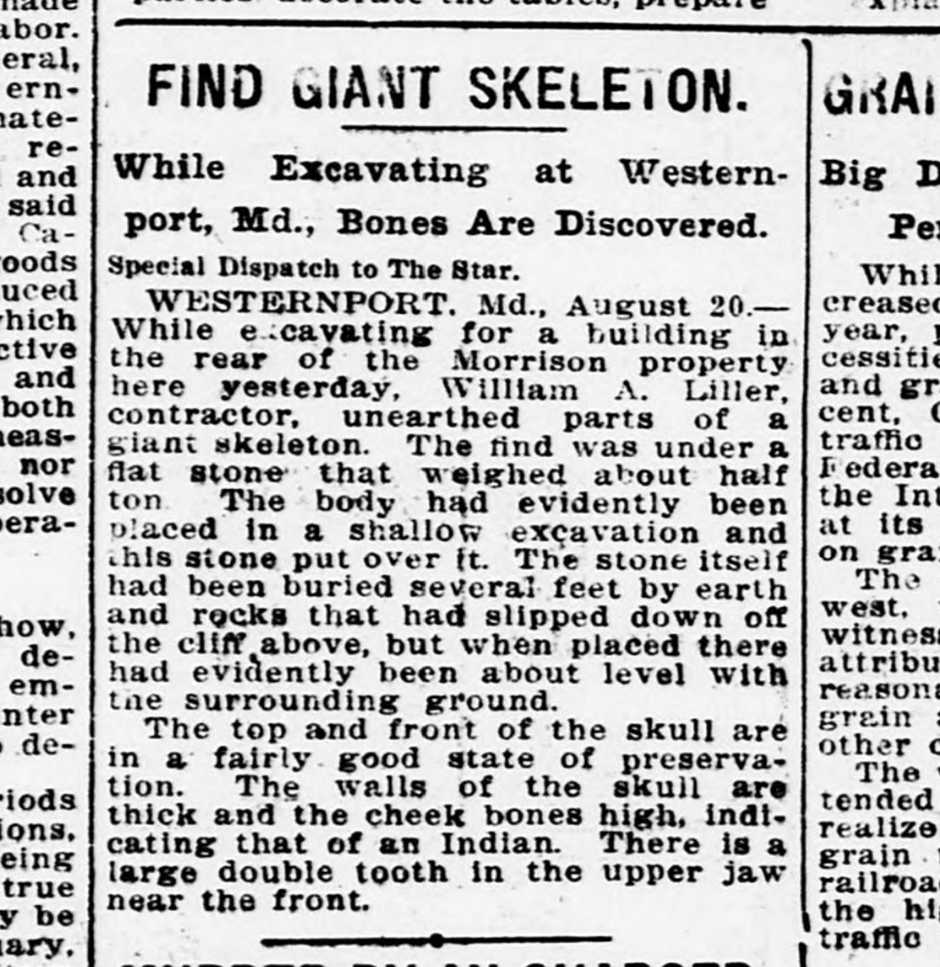 FIND GIANT SKELETON While Excavating at Westernport, Md., Bones Are Discovered. WESTERNPORT. Md., August 20.—While excavating for a building in the rear of the Morrison property here yesterday, William A. Eiller, a contractor, unearthed parts of a giant skeleton. The find was under a flat stone that weighed about half ton. The body had evidently been placed in a shallow excavation and this stone put over it. The stone itself had been buried several feet by earth and rocks that had slipped down off the cliff above, but when placed there had evidently been about level with the surrounding ground.