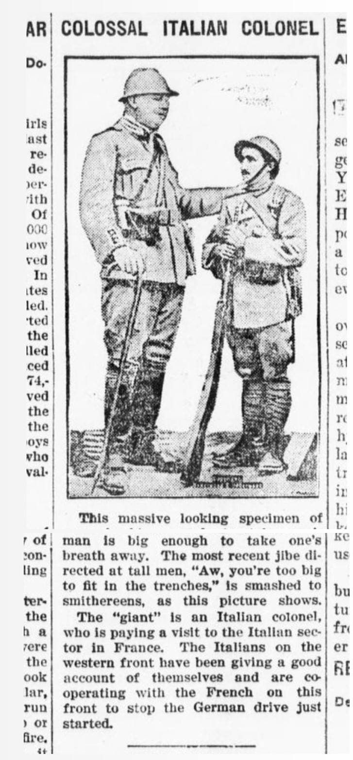 The “giant” is an Italian colonel, who is paying a visit to the Italian sector in France. The Italians on the western front have been giving a good account of themselves and are cooperating with the French on this front to stop the German drive just started.