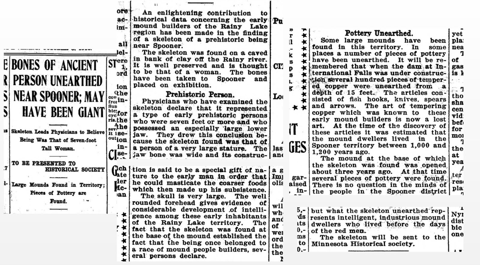 The skull is very large. The well rounded forehead gives evidence of considerable development of intelligence among these early inhabitants of the Rainy Lake territory. The fact that the skeleton was found at the base of the mound established the fact that the being once belonged to a race of mound people builders, several persons declare…The mound at the base of which the skeleton was found was opened about three years ago…The skeleton will be sent to the Minnesota Historical society.