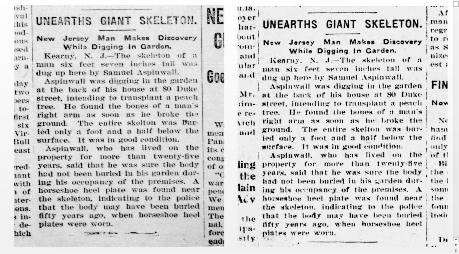 UNEARTHS GIANT SKELETON. New Jersey Man Make Discovery While Digging In Garden. Kearny, N. J.—The skeleton of man six feet seven inches tall was dug up here by Samuel Aspinwall. Aspiuwall was digging in the garden at the back of his house at 80 Duke street, intending to transplant a peach tree. He found the bones of a man’s right arm as soon as lie broke the ground. The entire skeleton was buried only a foot and a half below the surface. It was in good condition. Aspinwall, who has lived on the property for more than twenty-five years, said that he was sure the body had not been buried in his garden during his occupancy of the premises.