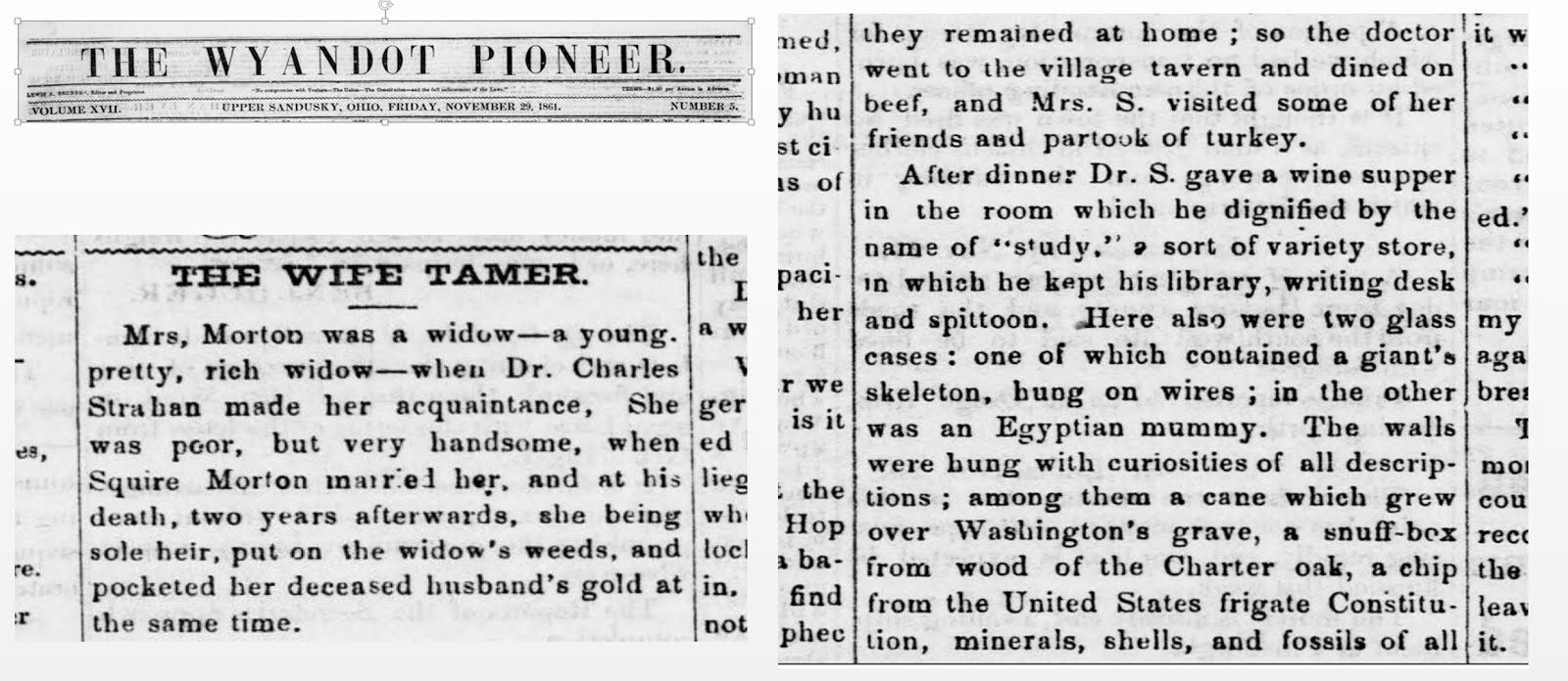 Mrs. Morton was a widow a young, pretty, rich widow when Dr. Charles Strahan…gave a wine supper in the room which he dignified by the name of “study,” sort of variety store, in which he kept his library, writing desk and spittoon. There also were two glass cases : one of which contained a giant’s skeleton, hung on wires ; in the other was an Egyptian mummy.