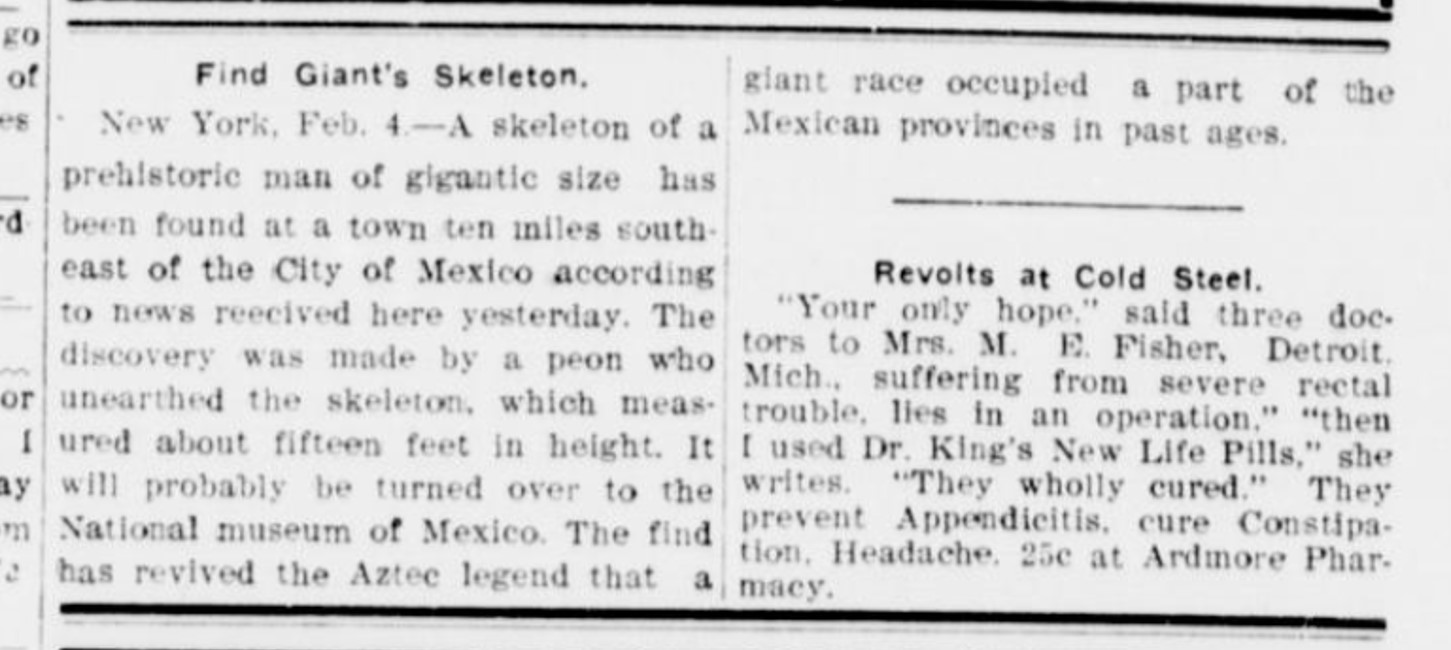 GIANT SKELETON FOUND IN MEXICO Charles C. Clapp a Boston broker of 19 Congress street, who has recently returned from Mexico, tells a remarkable story of the finding of the complete skeleton of a man who in life walked with his head nine feet above the earth. Mr. Clerk said: “Late one night, while we were sitting in the camp, a shot was heard from the distant hills. A party of us started out at once to investigate, for when the sound of a gun is heard in the State of Jalisco it means that a white man is shooting and that he means business. “We finally located the forman of the mines, who said that on going to the window of his hut he had seen two shining eyes below and had fired. We at once started on the hut, with men and torches, and discovered trances of a wounded mountain lion. Following the trial, we came to a cave, the mouth of which was blocked up with stones with the exception of a small hole where the stones had been clawed away, evidently by some wild animal. “We crawled through this hole with our torches and found ourselves in a long cave. We walked along until we came to a spacious apartment. Here strewn about on the floor of the cave were great numbers of human bones. I don’t pretend to have any scientific knowledge of the human frame, but picking over the bones I was able to articulate a complete human skeleton, which measured just 8 feet 11 inches. “The femur measure up to my thigh, the ribs were mare like those of a horse, the molars were big enough to crack a cocoanut, and the head from front to back measured 18 inches. I imagine there were enough of these bones to make 200 complete skeletons. “The cave was evidently the burial place of a race of giants who antedate the Aztecs, and who subsisted upon the abundant game of the locality. Together with the bones, among the various relics found, was a massive stone hatchet, weighing 30 pounds. “The Mexican government holds a jealous guard over its relics and buried treasures so that in order for the bones to be brought from that country for American scientists to study, it will be necessary for some noted archeologist to go down and arrange for their removal. I intend to see Professor Alexander Agassiz in regard to my discovery, and see if some attempt can be made to secure some of the bones to bring here.