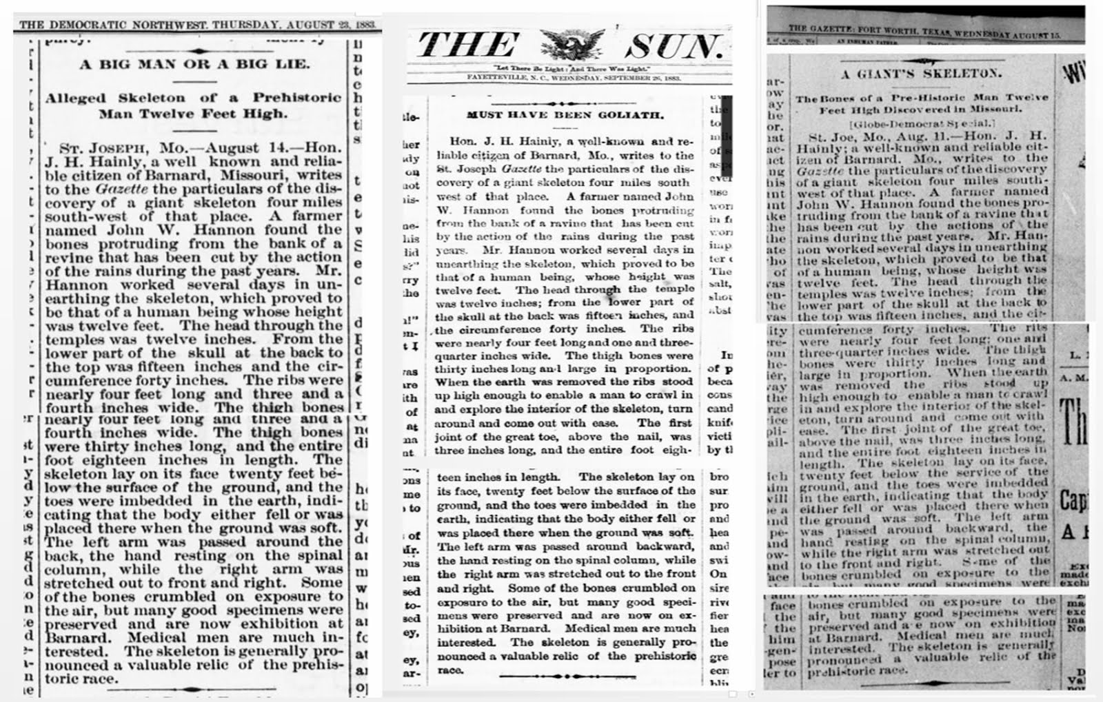 The Sun., September 26, 1883, “MUST HAVE BEEN GOLIATH” also in Fort Worth Daily Gazette., August 15, 1883, Page 7 “A GIANT’S SKELETON” and Democratic Northwest., August 23, 1883: