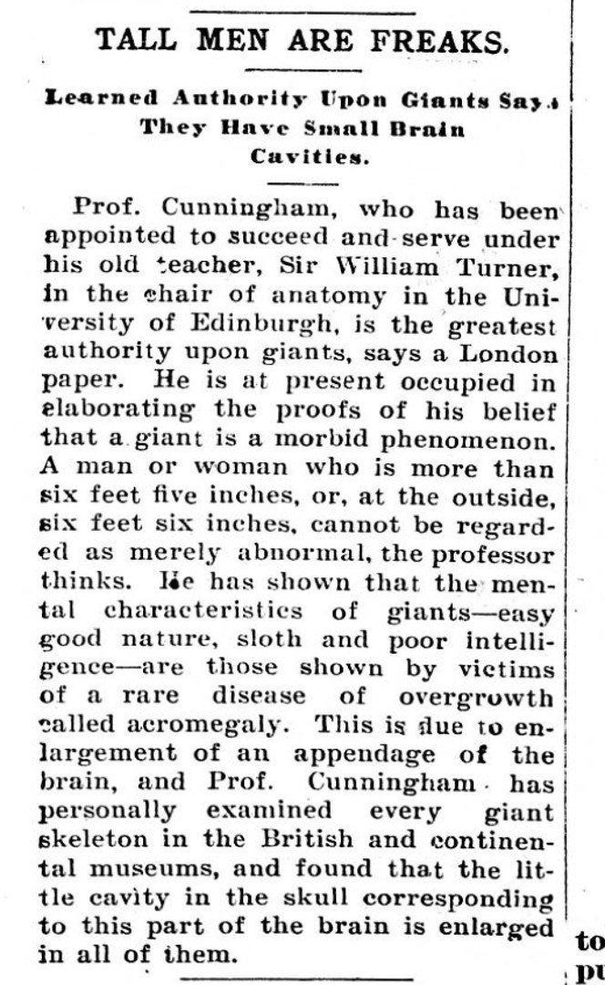 TALL MEN ARE FREAKS. Learned Authority Upon Giants Says They Have Small Brain Cavities. Prof. Cunningham, who has been appointed to succeed and serve under his old teacher, Sir William Turner, in the hair of anatomy in the University of Edinburgh, is the greatest authority upon giants, says a London paper. He is at present occupied in elaborating the proofs of his belief that a giant is a morbid phenomenon.