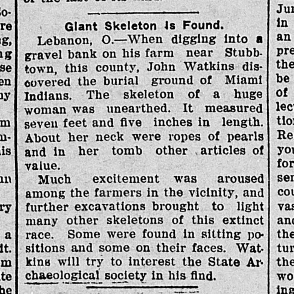 Giant Skeleton Is Found. Lebanon, O.—When digging into a gravel bank on his farm near Stubbtown, this county, John Watkins discovered the burial ground of Miami Indians. The skeleton of a huge woman was unearthed. It measured seven feet and five inches in length.