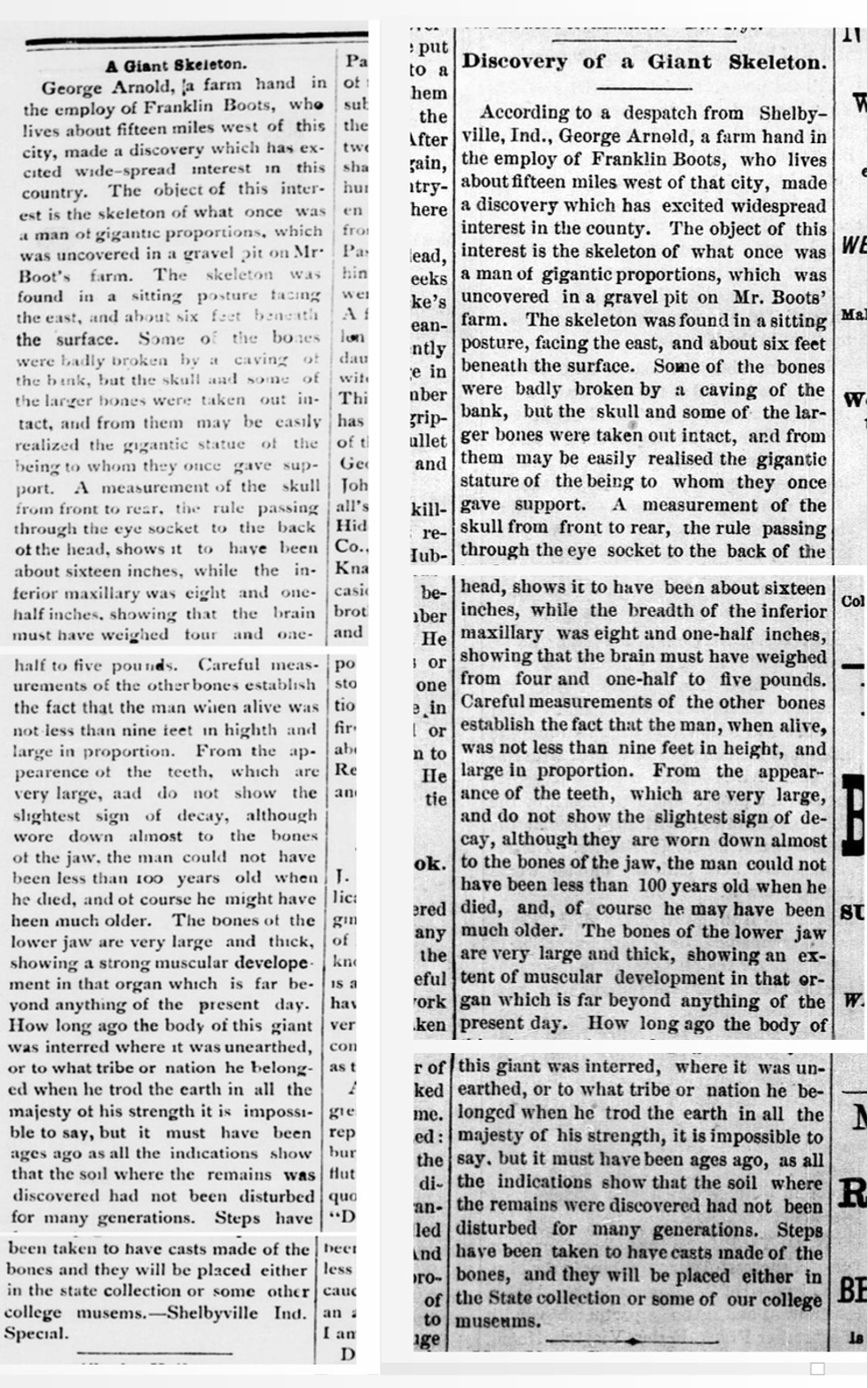 The Benton Weekly Record., September 15, 1883, “Discovery of a Giant Skeleton” and The Butler Weekly Times., October 10, 1883, “A Giant Skeleton”: