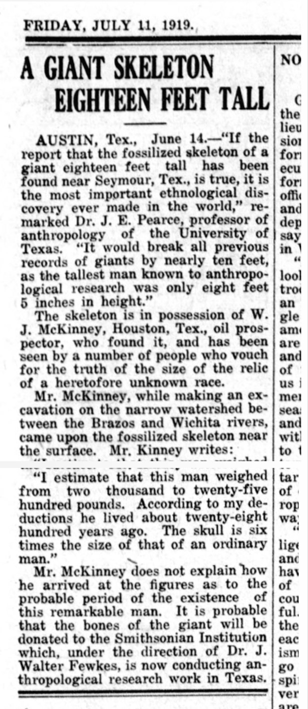 A GIANT SKELETON EIGHTEENFEET TALL AUSTIN, Tex., June 14.—”If the report that the fossilized skeleton of a giant eighteen feet tall has been found near Seymour, Tex., is true, it is the most important ethnological discovery ever made in the world,” remarked Dr. J. E. Pearce, professor of anthropology of the University of Texas. “It would break all previous records of giants by nearly ten feet, as the tallest man known to anthropological research was only eight feet 5 inches in height.” The skeleton is in possession of W. J. McKinney, Houston, Tex., oil prospector, who found it, and has been seen by a number of people who vouch for the truth of the size of the relic of a heretofore unknown race. Mr. McKinney, while making an excavation on the narrow watershed between the Brazos and Wichita rivers, came upon the fossilized skeleton near the surface. Mr. Kinney writes: “I estimate that this man weighed from two thousand to twenty-five hundred pounds. According to my deductions he lived about twenty-eight hundred years ago. The skull is six times the size of that of an ordinary man.”