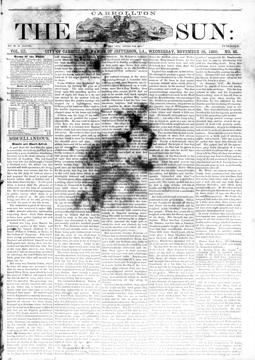The Carrollton Sun., November 28, 1860, “Giants are Short-Lived” this one is about modern day “giants” (modern back in 1860. I will not transcribe the long story but as with all images, you can enlarge it.