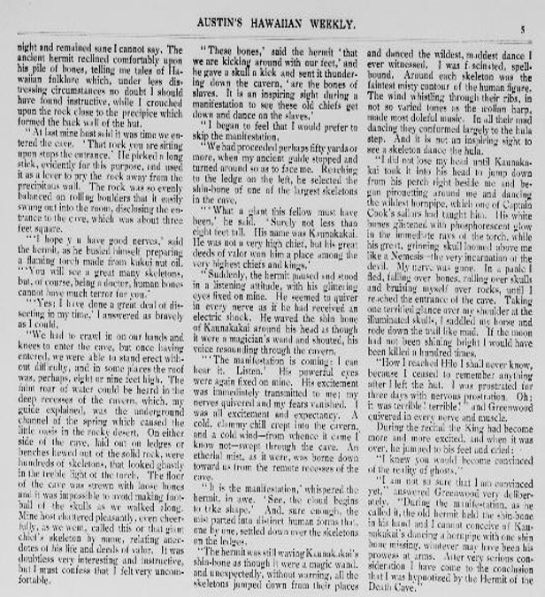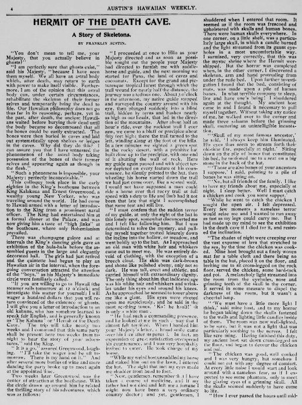 HERMIT OF THE DEATH CAVE. A Story of Skeletons. BY FRANKLIN AUSTIN. I cannot tell whether this “Story” relates facts or is fiction. In any case, it is of a discussion between “your Majesty” and some someone and relates to “Our Hawaiian philosophy” in part, with reference to burial rites with regards to ghosts, “the ancient Hawaii and waited before burying their dead until the body became so decomposed that all the bones could be easily extracted.” It then claims that “This colloquy took place in the early eighties in the King’s boathouse between King Kalakaua and Ernest Greenwood, a wealthy young New Yorker” named Greenwood whom the King encourages to “investigate this matter for yourself”: As I approached an old man [“The Kahuna” or “Hermit of the Death Cave”] with white hair and whiskers came out to meet me. He was entirely devoid of clothing, with the exception of a breech clout. His skin was dark-brown and shone like polished ebony, only not so dark. He was tall, erect and athletic, and carried himself with extraordinary dignity. The only thing about him that indicated age was his white hair and whiskers and wrinkles under his eyes and around his knees. As he approached he seemed to tower above me like a giant… I entered the hut. The sight that met my eyes made me shudder from head to foot…It seemed as if the room was frescoed and upholstered with skulls and human bones. There were human skulls everywhere. In one corner, on a little shelf, was a particularly large skull, in which a candle burned and the light streamed from its gaunt eye holes in a most uncomfortable way. My ancient host came in…walked over to the corner and made three salaams before the grinning skull, muttering an unintelligible incantation. “‘Skull of my most famous ancestor,’ he said…