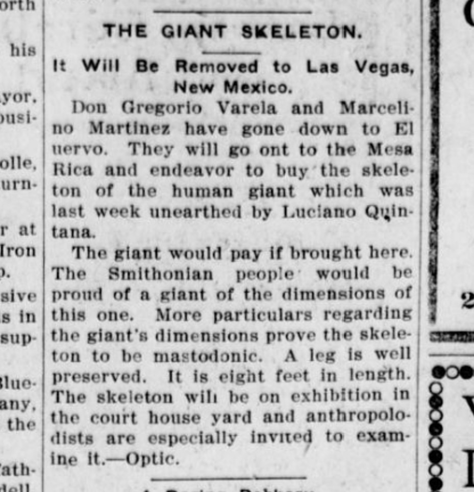 THE GIANT SKELETON. It Will Be Removed to Las Vegas, New Mexico. Don Gregorio Varela and Marcelino Martinez have gone down to El Cuervo. They will go on to the Mesa Rica and endeavor to buy the skeleton of the human giant which was last week unearthed by Luciano Quintana. The giant would pay if brought here. The Smithsonian people would be proud of a giant of the dimensions of this one.