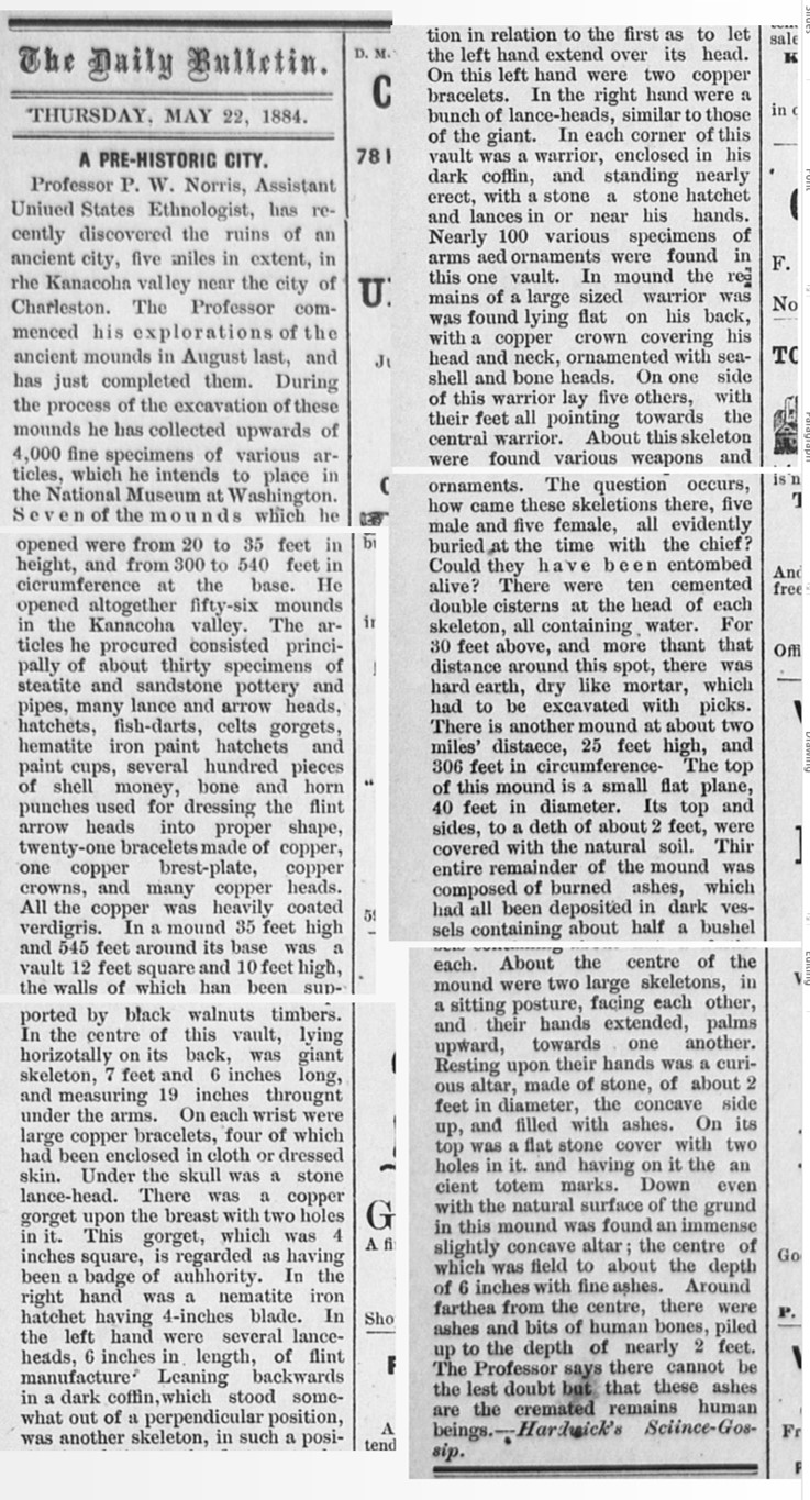 A PRE-HISTORIG CITY. Professor P. W. Norris, Assistant United States Ethnologist, has recently discovered the ruins of ancindent city, five miles in extent, in the Kanacoha valley near the city of Charleston…lying horizontally on its back, was giant skeleton, 7 feet and 6 inches long, and measuring 19 inches througnt [sic.] under the arms. On each wrist were large copper bracelets, four of which had been enclosed in cloth or dressed skin. Under the skull was a stone lance-head. There was a copper gorget upon the breast with two holes in it. This gorget, which was 4 inches square, is regarded as having been a badge of authority. In the right hand was a nematite iron hatchet having 4-inches blade. In the left hand were several lance heads, 6 inches in. length, of flint manufacture. Leaning backwards in a dark coffin, which stood somewhat out of a perpendicular position, was another skeleton, in such a position in relation to the first as to let the left hand extend over its head. On this left hand were two copper bracelets. In the right hand were a bunch of lance-heads, similar to those of the giant. In each corner of this vault was a warrior, enclosed in his dark coffin, and standing nearly erect, with a stone a stone hatchet and lances in or near his hands… In mound the remains of a large sized warrior was found lying flat on his back, with a copper crown covering his head and neck, ornamented with sea shell and bone heads. On one side of this warrior lay five others, with their feet all pointing towards the central warrior. About this skeleton were found various weapons and ornaments… About the centre of the mound were two large skeletons, in a sitting posture, facing each other, and their hands extended, palms upward, towards one another. Resting upon their hands was a curious altar, made of stone, of about 2 feet in diameter, the concave side up, and filled with ashes. On its top was a fiat stone cover with two holes in it, and having on it the ancient totem marks. Down even with the natural surface of the ground in this mound was found an immense slightly concave altar ; the centre of which was field to about the depth of 6 inches with fine ashes. Around farther from the centre, there were ashes and bits of human bones, piled up to the depth of nearly 2 feet. The Professor says there cannot be the lest doubt but that these ashes are the cremated remains human