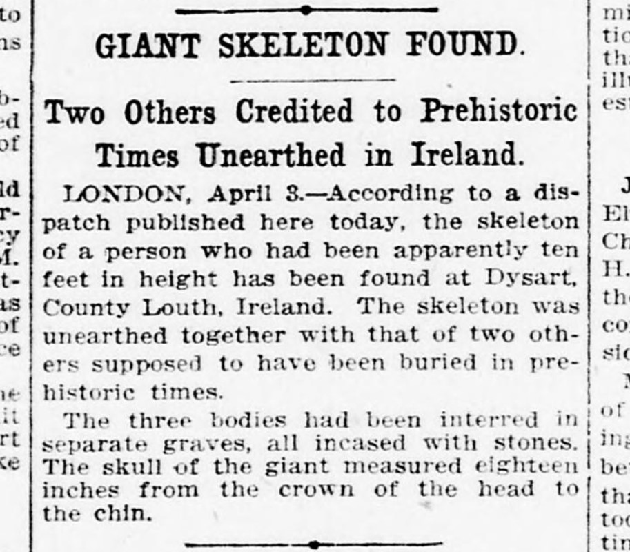 LONDON, April 3.—According to a dispatch published here today, the skeleton of a person who had been apparently ten feet in height has been found at Dysart, County Louth, Ireland. The skeleton was unearthed together with that of two others supposed to have been buried in prehistoric times. The three bodies had been interred in separate graves, all incased with stones. The skull of the giant measured eighteen inches from the crown of the head to the chin.