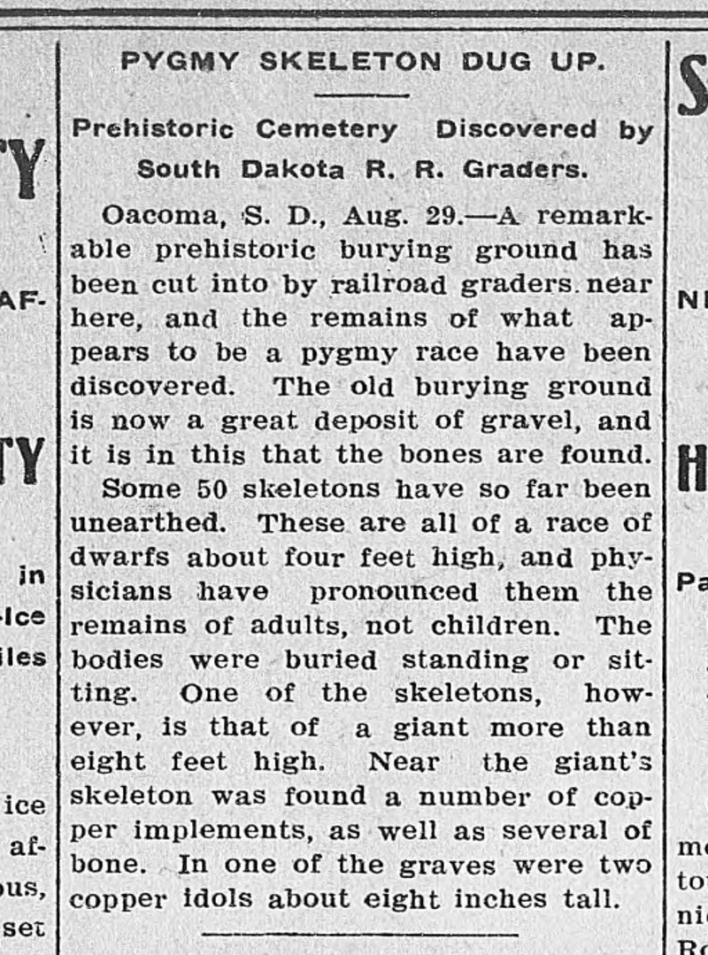 PYGMY SKELETON DUG UP. Prehistoric Cemetery Discovered by South Dakota R. R. Graders. Oacoma, S. D., Aug. 29.—A remarkable prehistoric burying ground has been cut into by railroad graders near here, and the remains of what appears to be a pygmy race have been discovered. The old burying ground is now a great deposit of gravel, and it is in this that the bones are found.