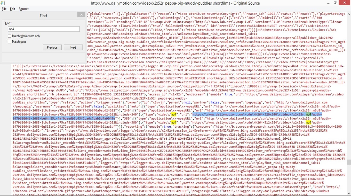 You will note that shortly after the second “mp4” there is a strange looking URL which in this case is, http:\/\/www.dailymotion.com\/cdn\/H264-320×240\/video\/x2x52r.mp4?auth=1479610646-2688-be6nr85i-4af0deedb3c43f2ca6c7bab5d4a9049e
