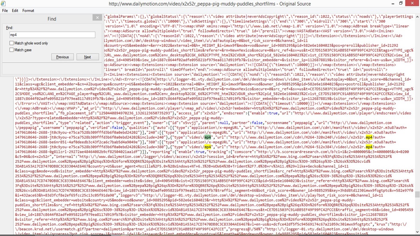Simply Ctrl+F or “Edit” tab and “Find” and search for “mp4.” The first mp4 it will find is not our goal so click on “Next” or hit “Enter” to find the one that is not always but most often, the second one.