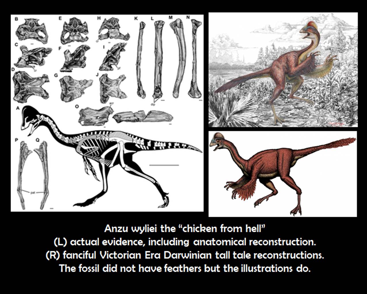 So, does art (in this case myth) imitate life (in this case the Anzu fossil)? Or visa versa? The reasoning appears to be that since the “feathered demon” was “presumably feathered” then the un-feathered fossil can be depicted (illustrated, reconstructed, and reported) as being feathered. A perfect example of modern day myth making wearing the guise of science.