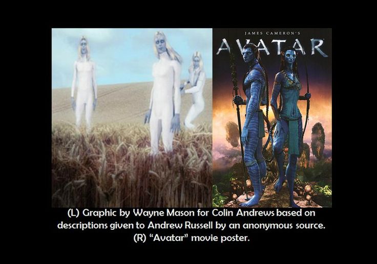 But why “figures” and not “people” or “subjects” as a police sergeant may term them? Well, they all had blond hair. Since they were “inspecting the crop,” the source, initially, thought that they were “forensic officers” investigating the site. That they were blond perks up the ears of UFOlogists (or, UFOlatrists) as one species of aliens are called Nordics because they look just like blond haired, blue eyed humans. By the time that Andrew Russell is done with them, an illustration by Wayne Mason has them looking like the creatures from the Avatar movie with blond wigs and white one piece overalls.