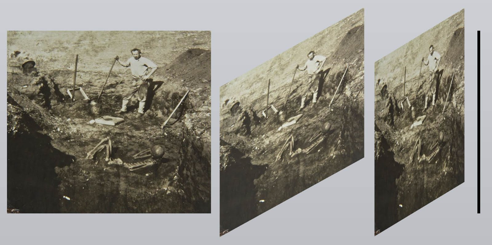 Marzulli’s methodology was to reproduce the photo above, cut Glidden and the skeleton out of it and rotate their respective physical frames so as to put them both into an upright posture which would result in being able to compare their heights as Glidden’s height is known to be 5 ft. 8 in. The calculations result in the skeleton being circa 8 ft. 9 in. tall.