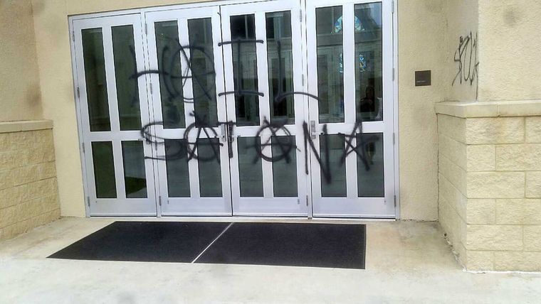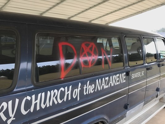 “Calvary Church of the Nazarene” and the nearby “Lakewood Baptist Church” had spray paint graffiti on their buildings, schools, vans, etc. including profanity and Satanic symbolism, “Hail Satan,” “God is dead,” 666 and “a derogatory slur for African Americans.”