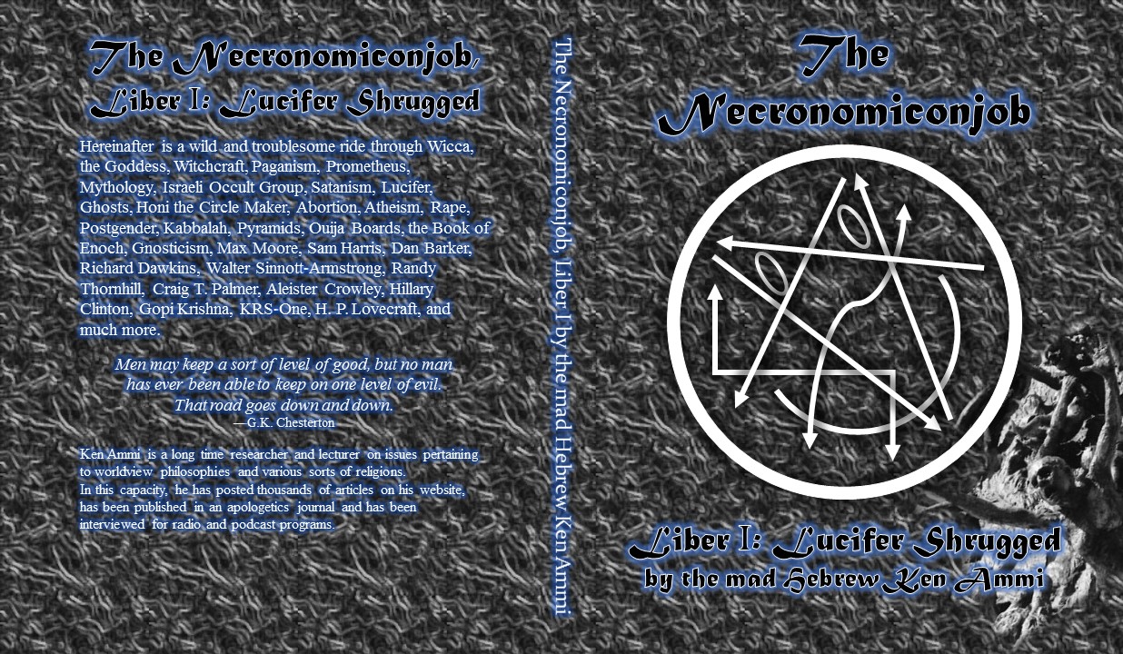 Hereinafter is a wild and troublesome ride through Wicca, the Goddess, Witchcraft, Paganism, Prometheus, Mythology, Israeli Occult Group, Satanism, Lucifer, Ghosts, Honi the Circle Maker, Abortion, Atheism, Rape, Postgender, Kabbalah, Pyramids, Ouija Boards, the Book of Enoch, Gnosticism, Max Moore, Sam Harris, Dan Barker, Richard Dawkins, Walter Sinnott-Armstrong, Randy Thornhill, Craig T. Palmer, Aleister Crowley, Hillary Clinton, Gopi Krishna, KRS-One, H. P. Lovecraft, and much more. There are the Necronomicon HP Lovecraft, the Necronomicon Simon, the Necronomicon Spellbook, etc., but this is a carrion bird of a different color.