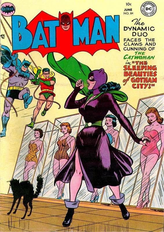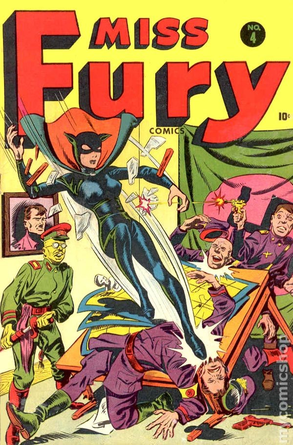 Miss Fury first appeared in 1941 as Black Fury, dressed in a black satin catsuit later appropriated by DC’s Catwoman. Miss Fury’s adventures are rife with bondage, lingerie, and cat fights…